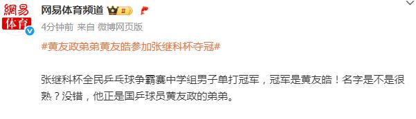 据网易体育频道报道:国乒选手黄友政弟弟黄友皓获得张继科杯中学组男子单打冠军,获得奖金12000。颁奖时不同于另两位中学生,黄友皓面对张继科表情淡定,展现出了不同于这个年纪的成熟。