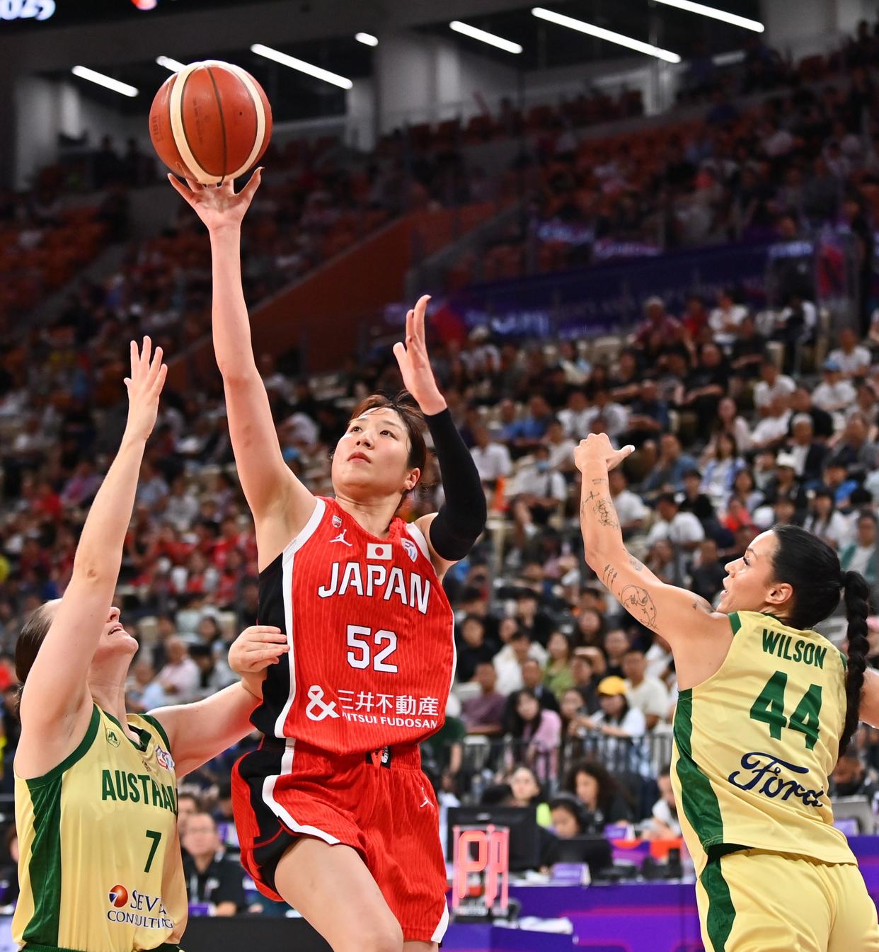 7月20日,日本队球员宫泽夕贵(中)在比赛中上篮。新华社记者 梁旭 摄