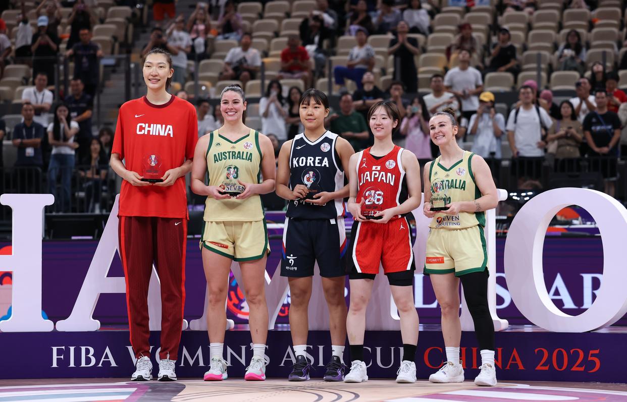 7月20日,入选本届女篮亚洲杯最佳阵容的中国队球员韩旭、澳大利亚队球员福勒、韩国队球员朴智贤、日本队球员田中心、澳大利亚队球员斯蒂芬妮(从左至右)在颁奖仪式上。新华社记者 毛思倩 摄