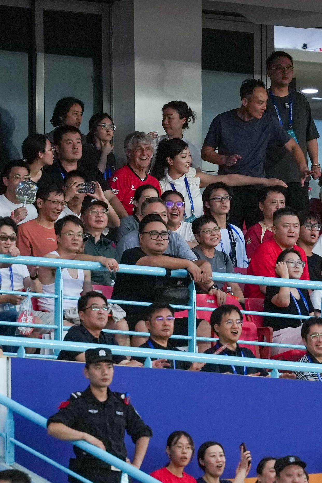 7月20日,前任中国男足主教练博拉·米卢蒂诺维奇(后排红衣)在场边观赛。新华社记者 李博 摄