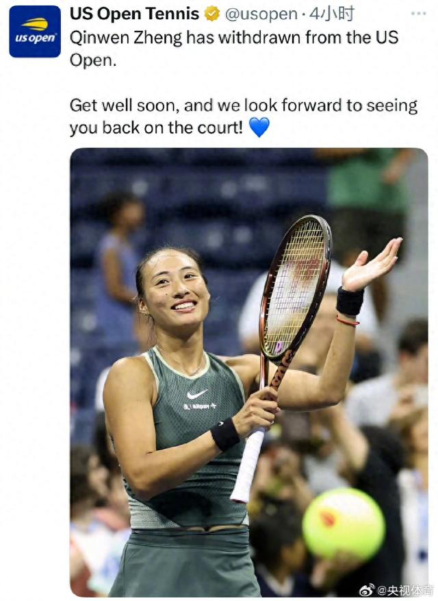 此次退赛是郑钦文职业生涯首次缺席大满贯赛事,美网官方向她送上祝福,期待她早日康复。