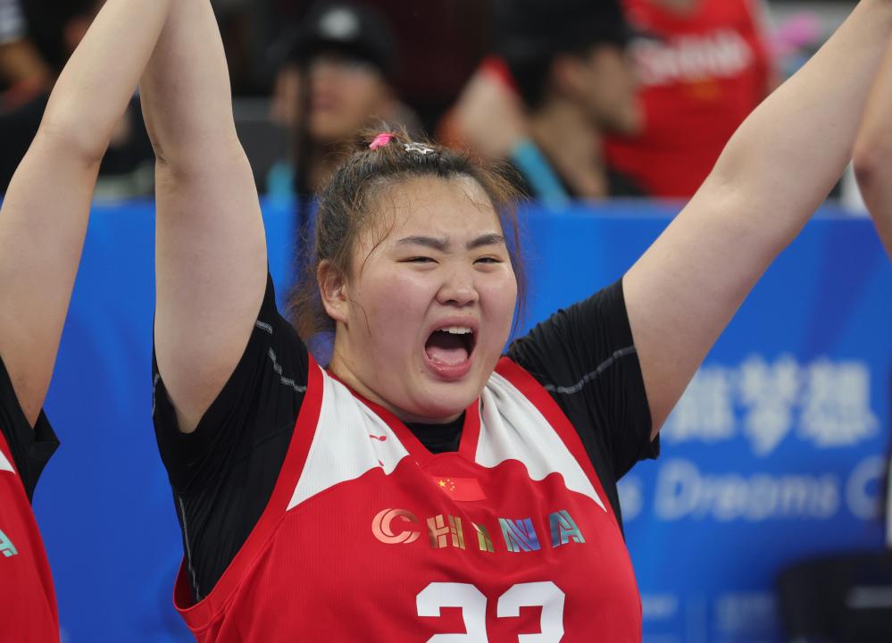 资料图:2023年8月5日,中国队球员刘禹彤在比赛后庆祝。当日,在成都大运会中,中国队夺得冠军。新华社记者 杨青 摄