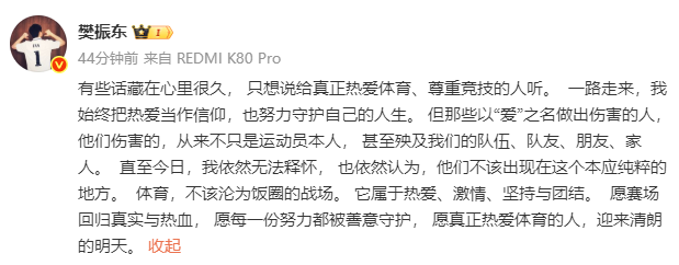一路走来,我始终把热爱当作信仰,也努力守护自己的人生。但那些以“爱”之名做出伤害的人,他们伤害的,从来不只是运动员本人,甚至殃及我们的队伍、队友、朋友、家人。直至今日,我依然无法释怀,也依然认为,他们不该出现在这个本应纯粹的地方。