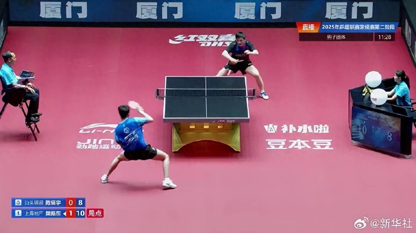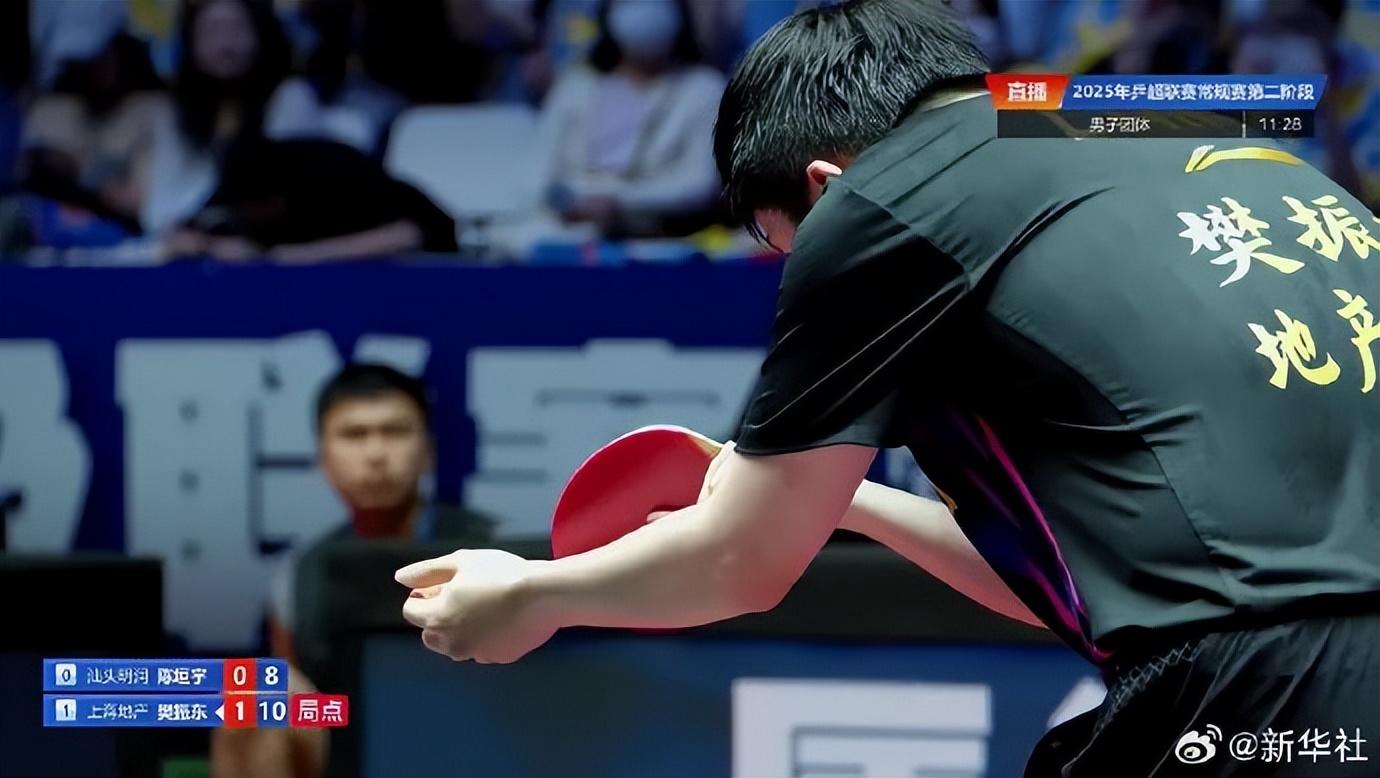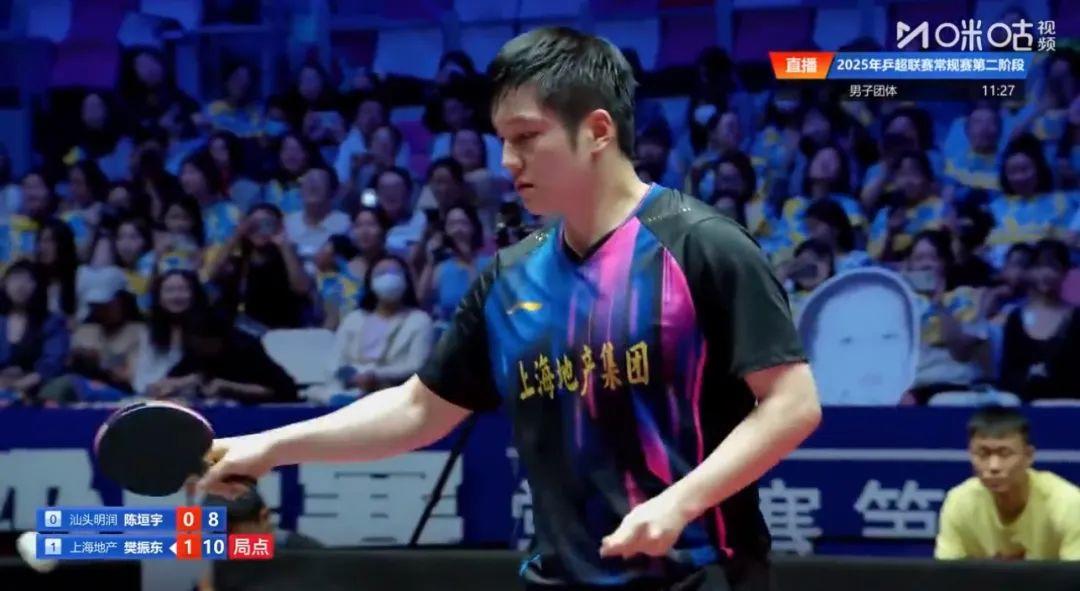 2025乒超联赛第二阶段比赛27日继续进行,上午上海地产集团对阵汕头明润的男子团体比赛中,樊振东在第二场男单比赛中出场,战胜对手陈垣宇,创造本赛季乒超联赛个人十一连胜。