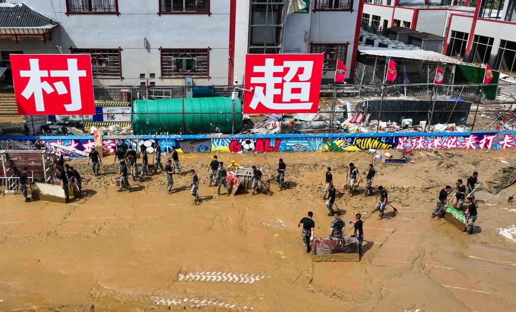 自首次洪灾就进入球场救灾,“村超”劲旅月寨村队队员李发雄、忠诚村队队员王香兵等,面对及膝的淤泥和遍地的建筑垃圾,毅然踏出了一条条道路。