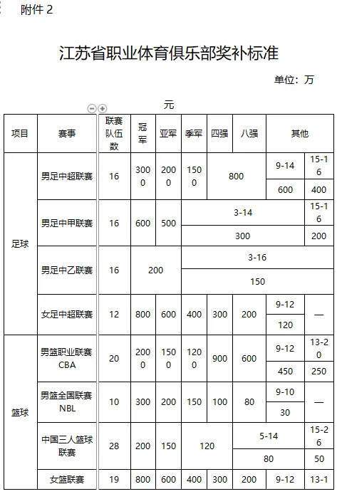 近日,江苏省体育局发布《江苏省职业体育俱乐部奖补标准》,俱乐部根据上一赛季参加的全国高级别职业联赛成绩申请奖补资金。
