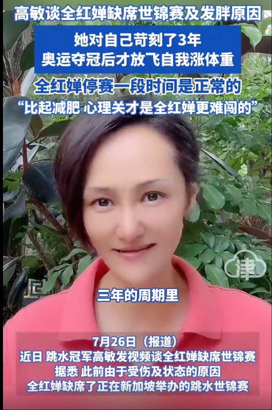 近日,蝉联1988年和1992年女子单人3米板奥运金牌的“跳水女皇”高敏发视频谈全红婵缺席世锦赛。