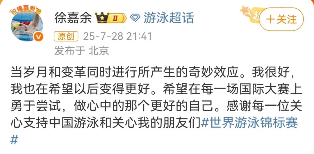 比赛结束后,徐嘉余在个人社交平台发文称,“当岁月和变革同时进行所产生的奇妙效应。我很好,我也在希望以后变得更好。希望在每一场国际大赛上勇于尝试,做心中的那个更好的自己。感谢每一位关心支持中国游泳和关心我的朋友们。 ”