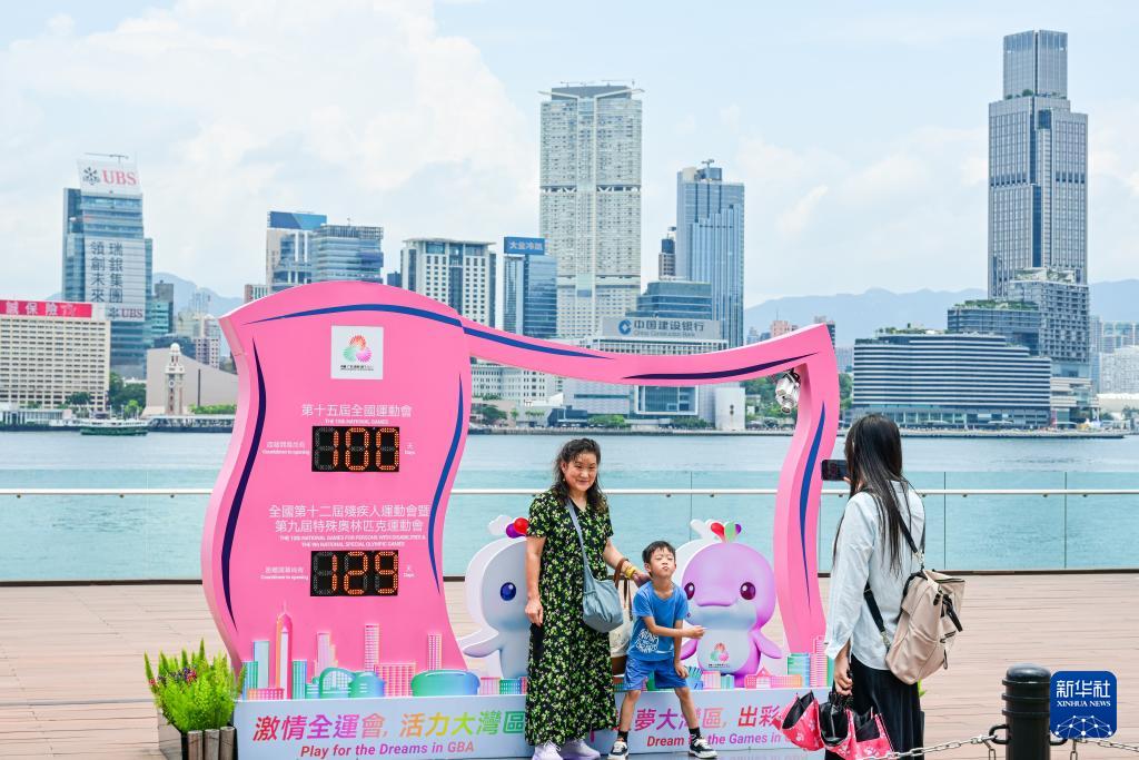 8月1日,游客在香港维港沿岸的第十五届全国运动会倒计时牌边合影。