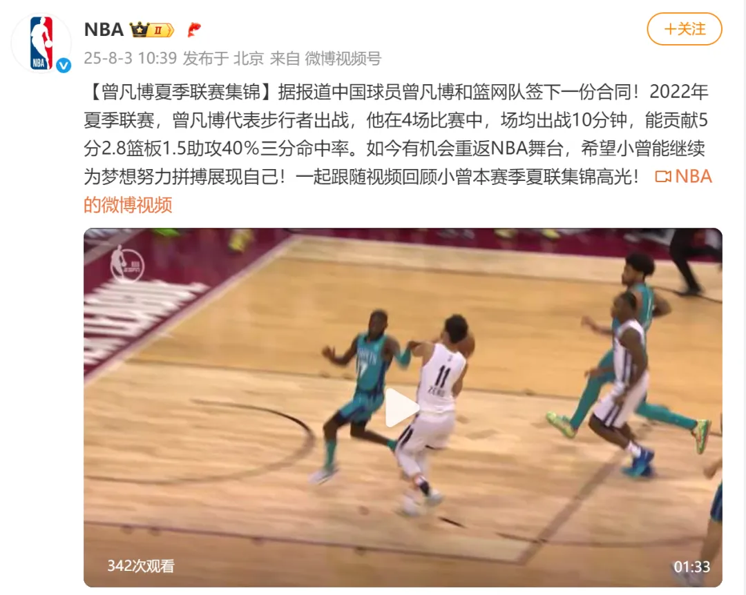 8月3日,据报道,中国球员曾凡博和篮网队签下一份合同!2022年夏季联赛,曾凡博代表步行者出战,他在4场比赛中,场均出战10分钟,能贡献5分2.8篮板1.5助攻40%三分命中率。