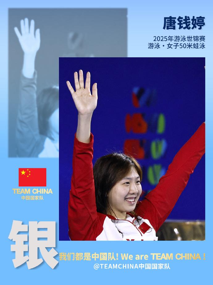 在刚刚结束的2025世界泳联世锦赛女子50米蛙泳决赛中,唐钱婷获得银牌。