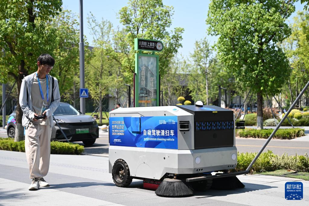 8月3日,在成都世运会运动员村,工作人员引导自动驾驶清扫车前往清扫区域。新华社记者 胥冰洁 摄