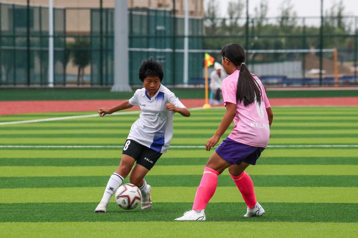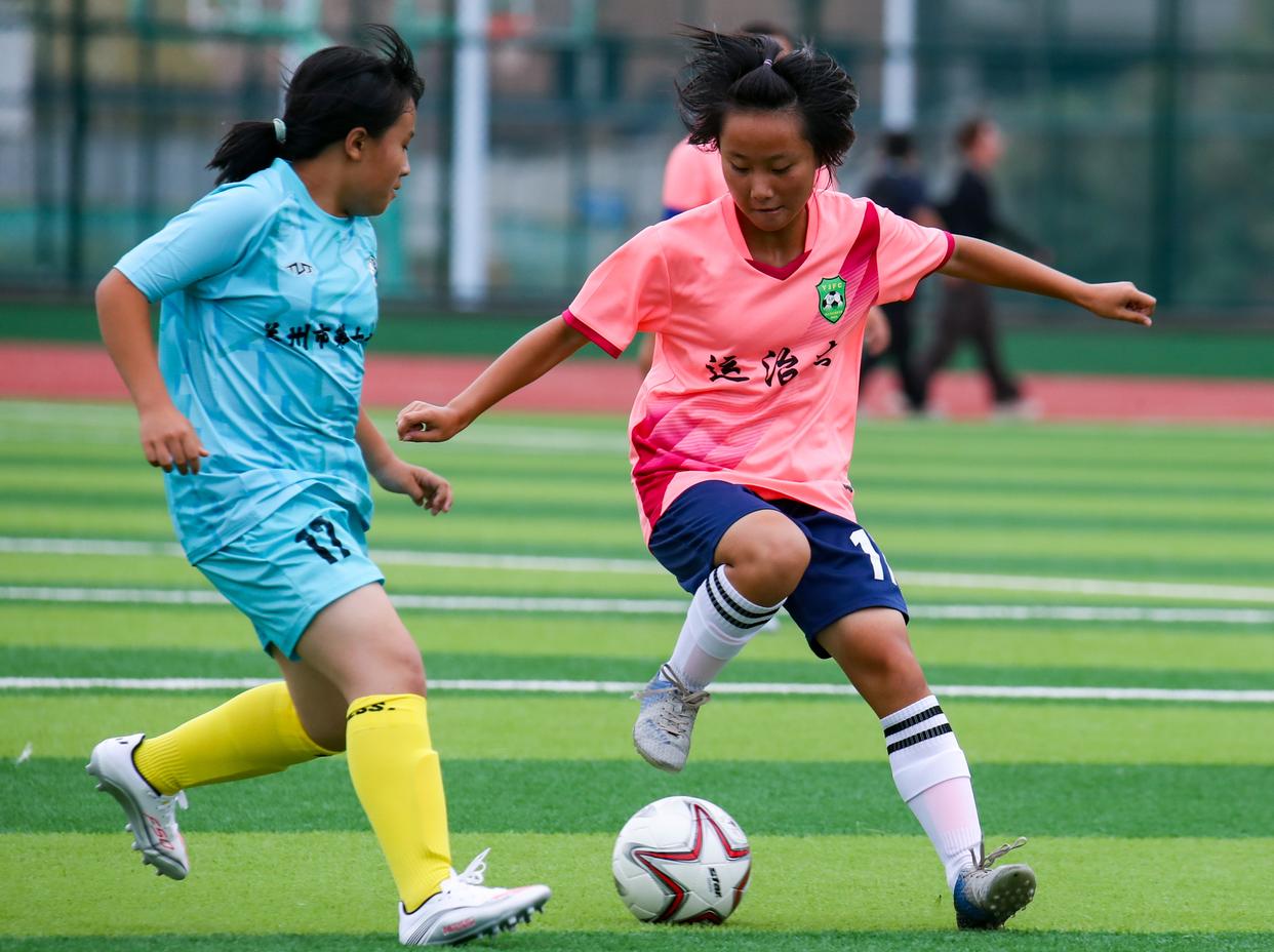 8月4日,河南省运之杰足球俱乐部球员崔梦洁(右)和来自甘肃省的兰州市第十一中学代表队球员沈樱宁在U13女子组比赛中拼抢。 新华社记者 郎兵兵 摄