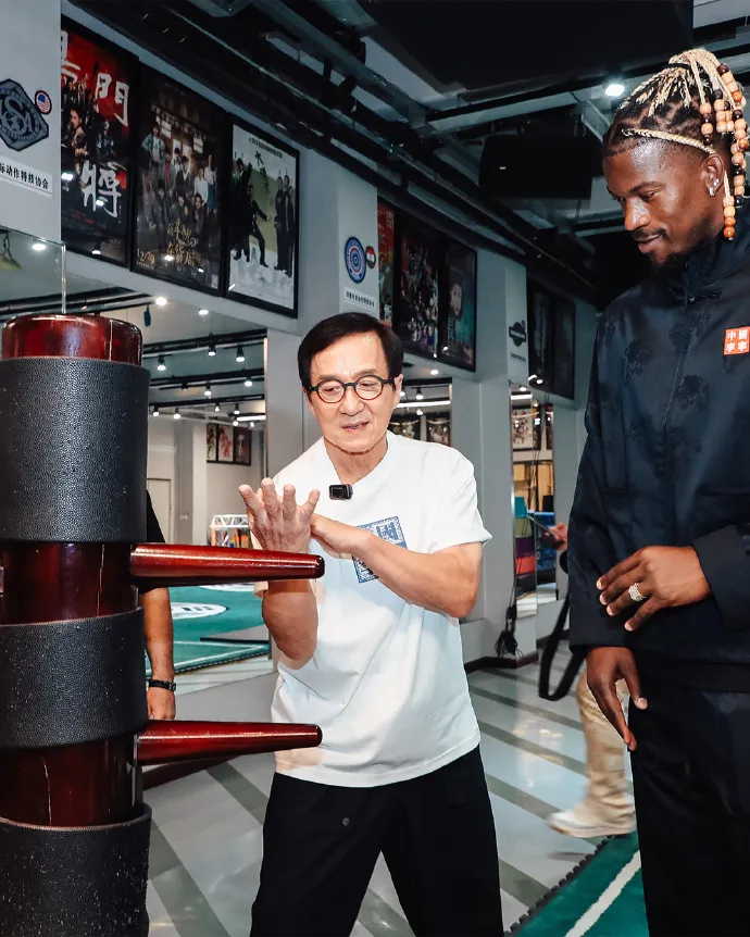 成龙还在现场即兴上演“功夫篮球”,并给教练球员们赠送了小熊猫。
