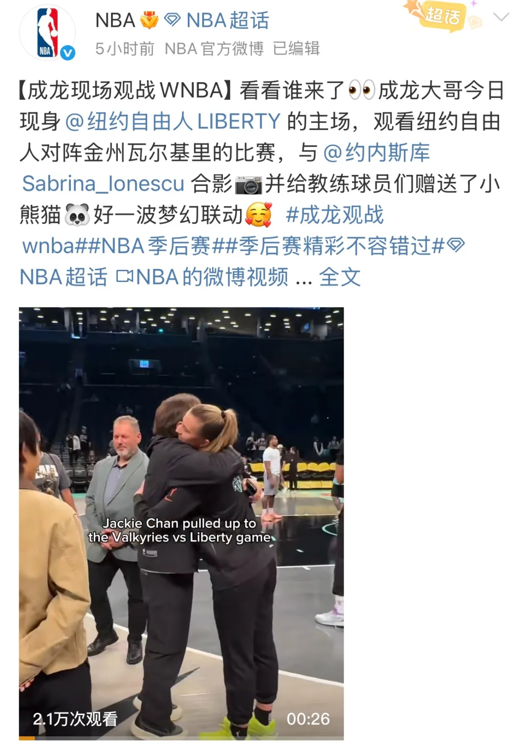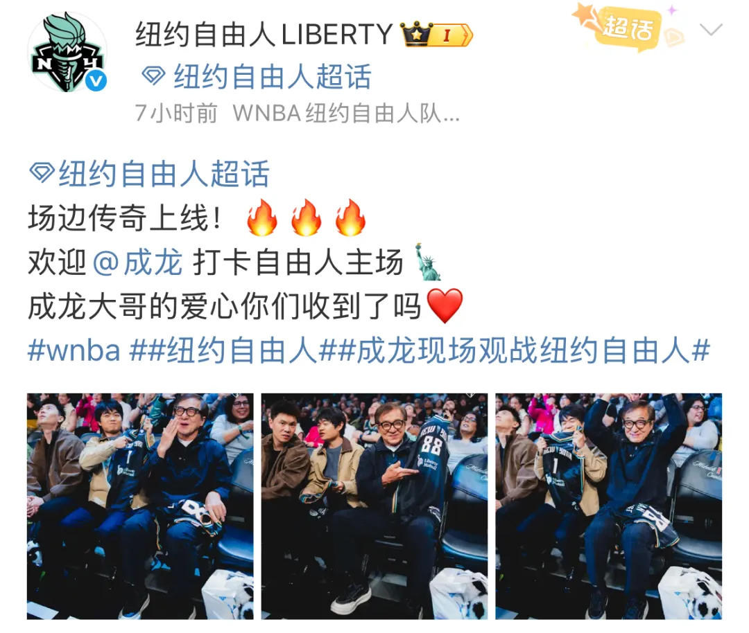 赛前,WNBA官方晒出71岁中国影星成龙与“女库里”纽约自由人核心约内斯库的合照。