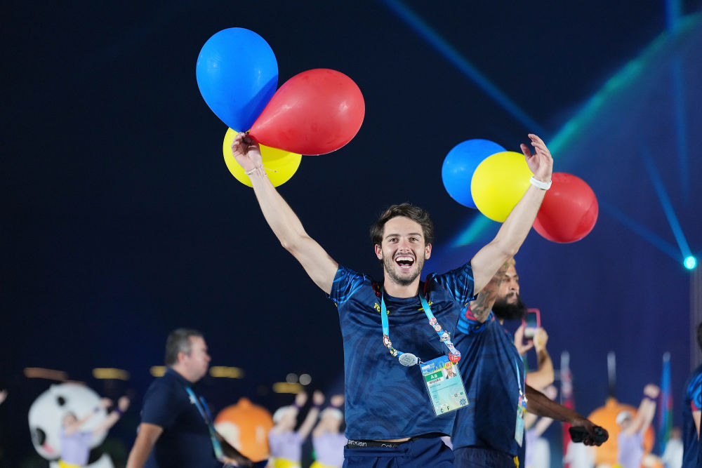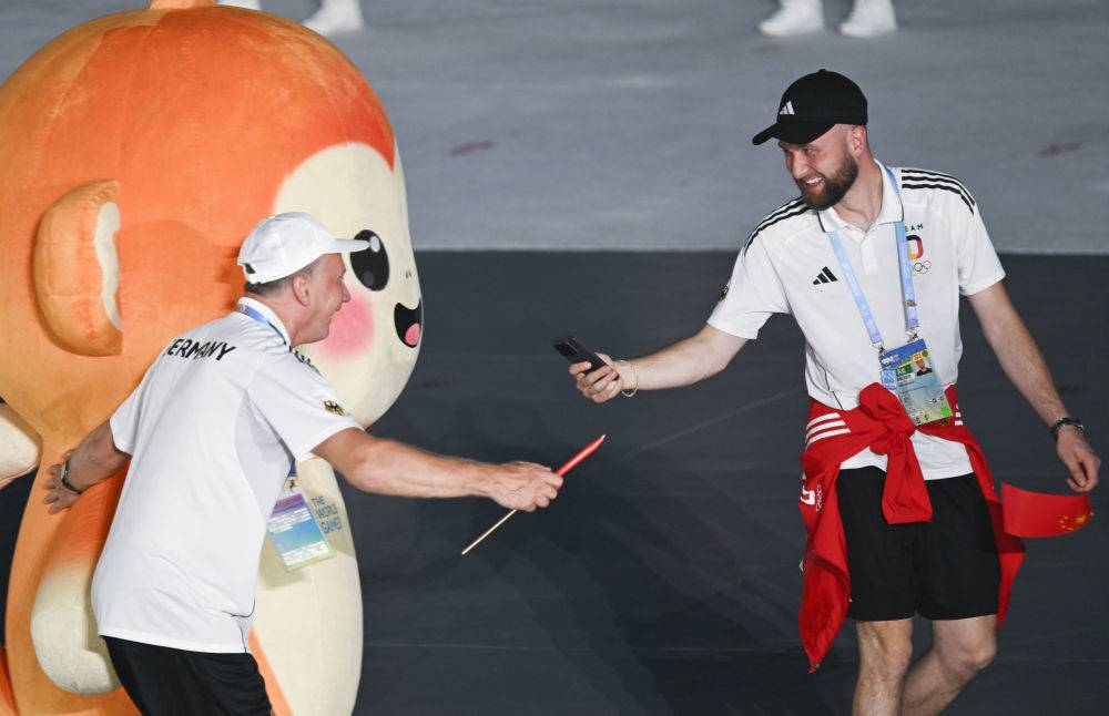 ↑德国代表团成员在开幕式上与吉祥物“锦仔”互动。新华社记者鲍菲菲摄