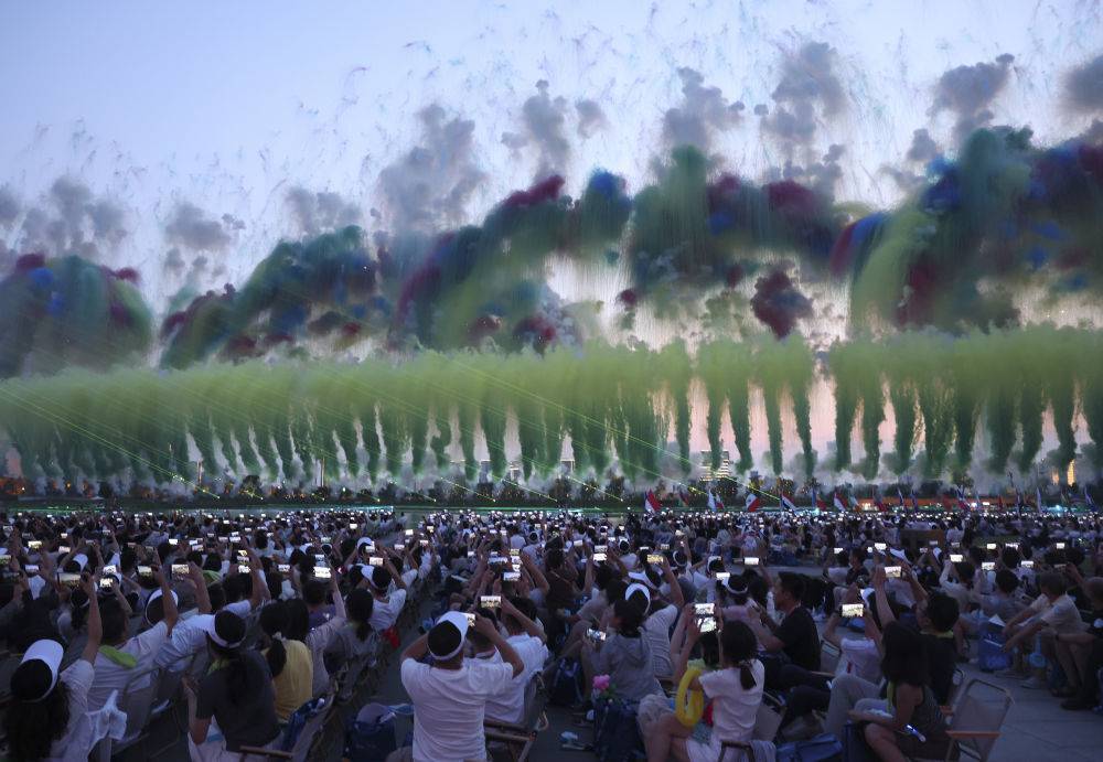↑现场观众拍摄开幕式焰火。新华社记者 陈斌摄