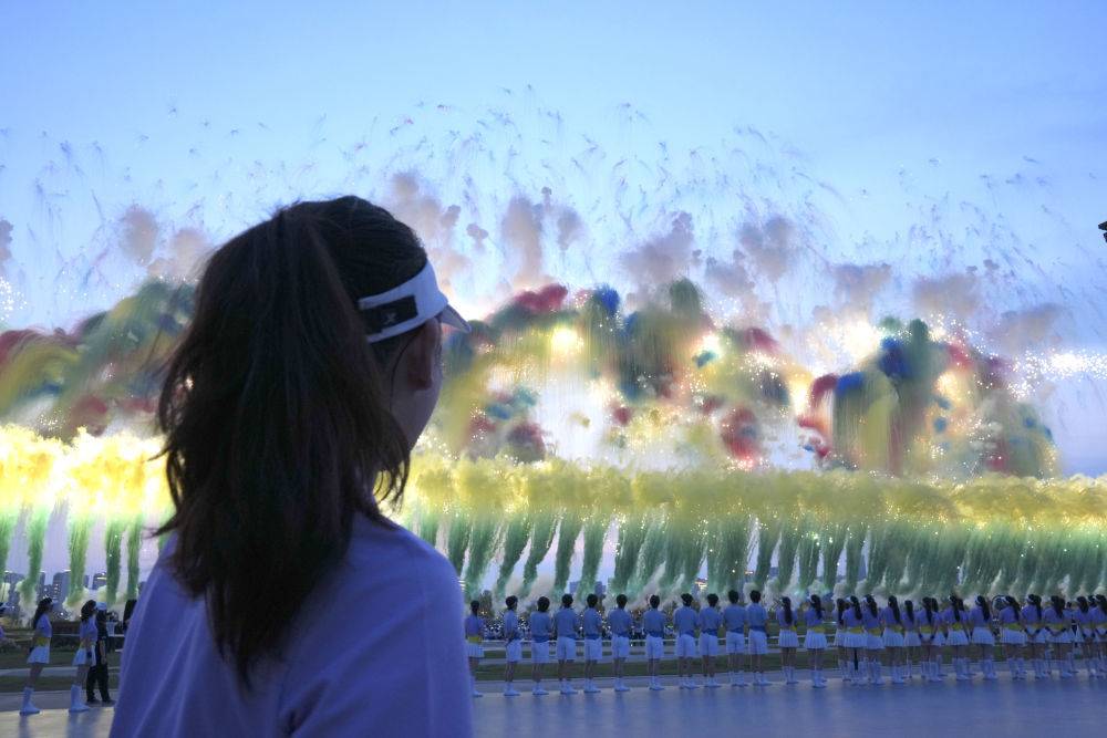 ↑一名志愿者观看开幕式焰火。新华社记者胥冰洁摄