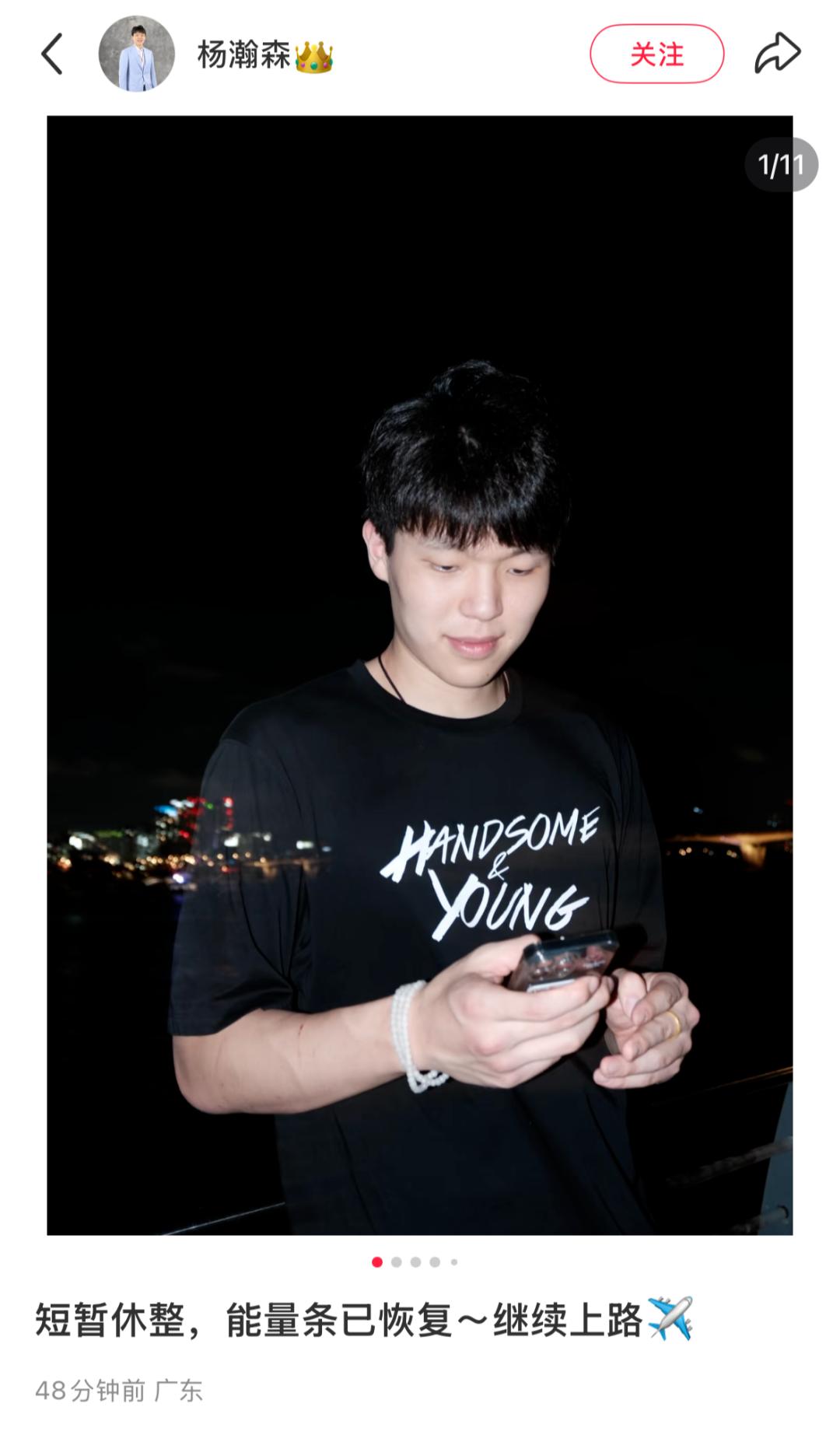 8月9日,中国球员杨瀚森在社交媒体发文:短暂休整,能量条已恢复~继续上路。