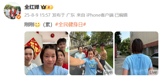 8月9日,此前因伤缺席世锦赛的全红婵分享了自己训练后的照片,T恤都被汗浸湿了,并配文“刚刚(累)”。