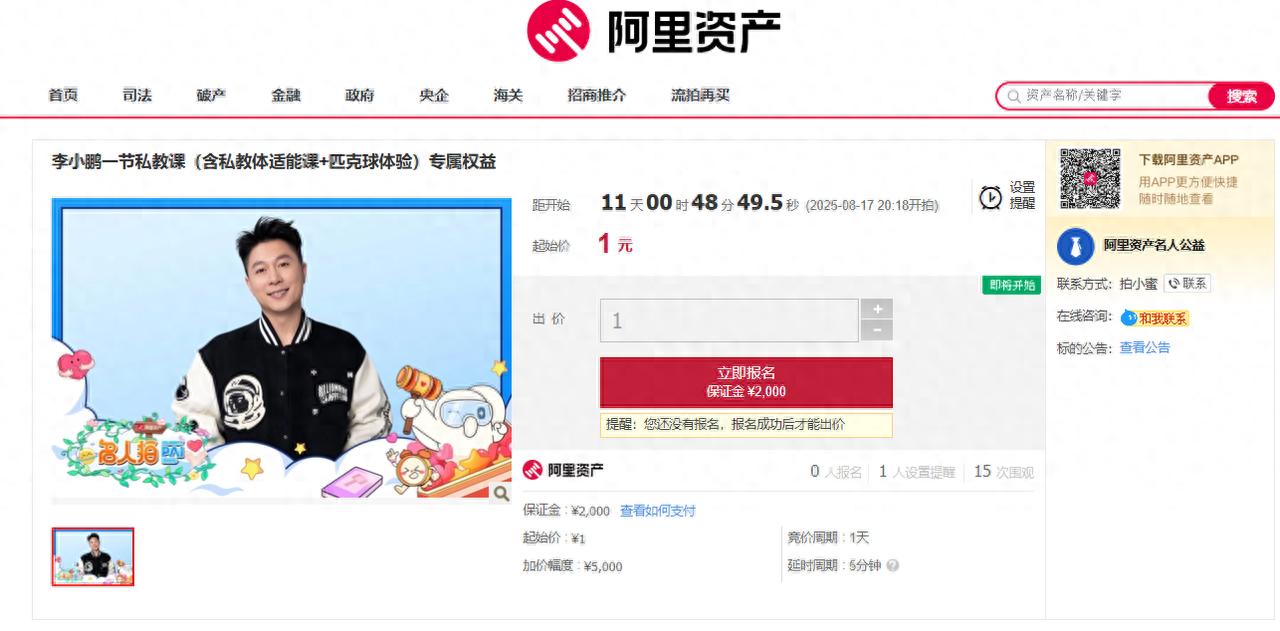一周以后,“李小鹏一节私教课(含体适能训练+匹克球体验)将在阿里资产平台上公开竞价。
