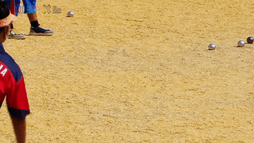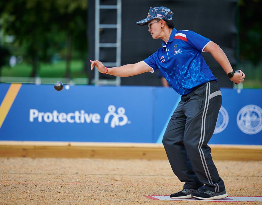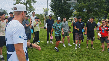 8月10日,美国队选手甘农在2025年成都世运会掷准飞盘比赛中。比赛中的这个目标是一个挂满铁链的筐