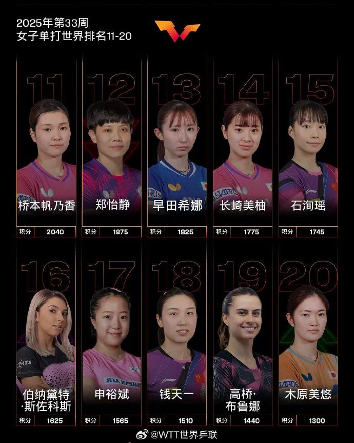8月12日,国际乒联公布2025年第33周排名。