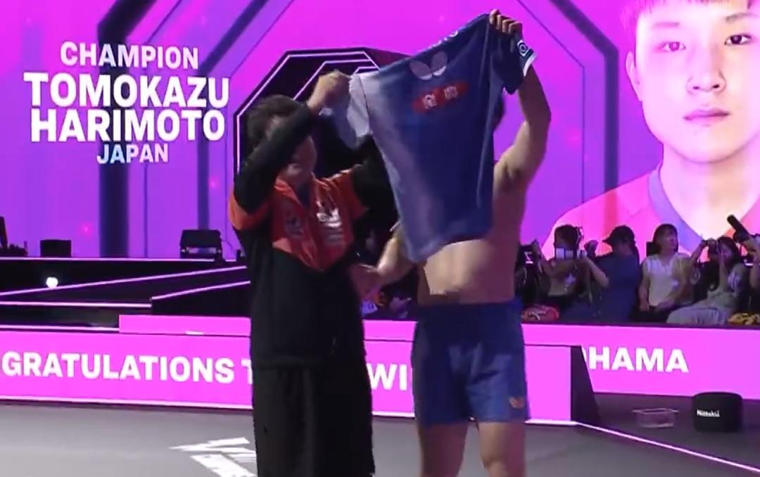 赛后,张本智和与王皓教练握手,脱衣庆祝并将球衣高高举起。