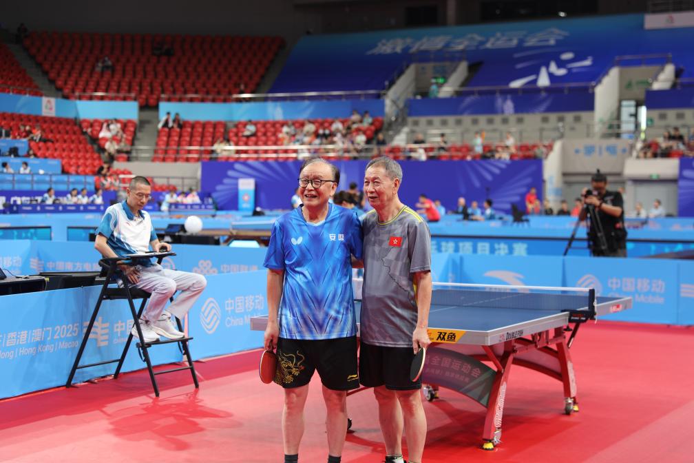 图为张耀钊(右)与安徽选手合影画面。图片来源:第十五届全国运动会群众赛事活动乒乓球竞赛委员会。