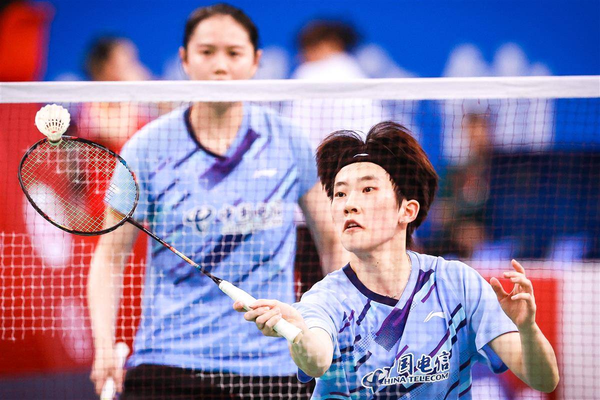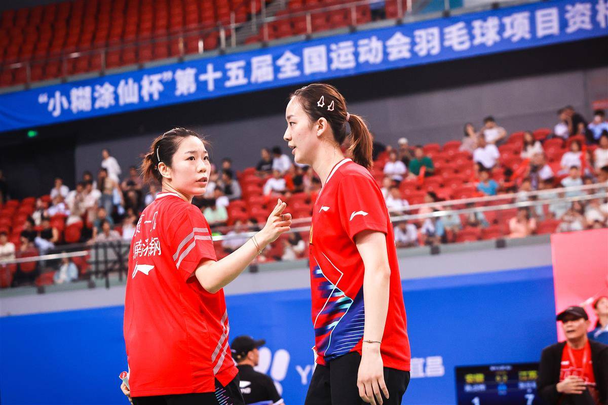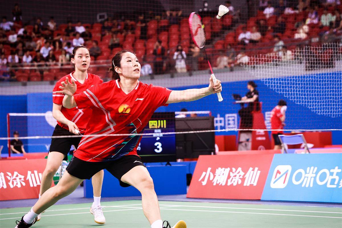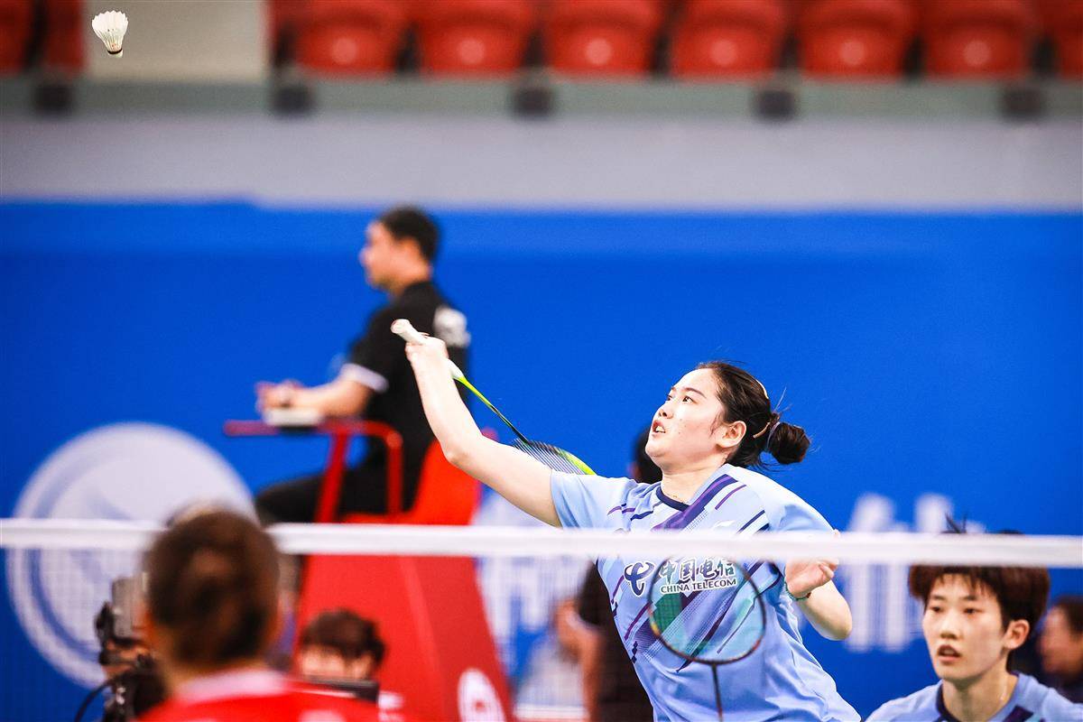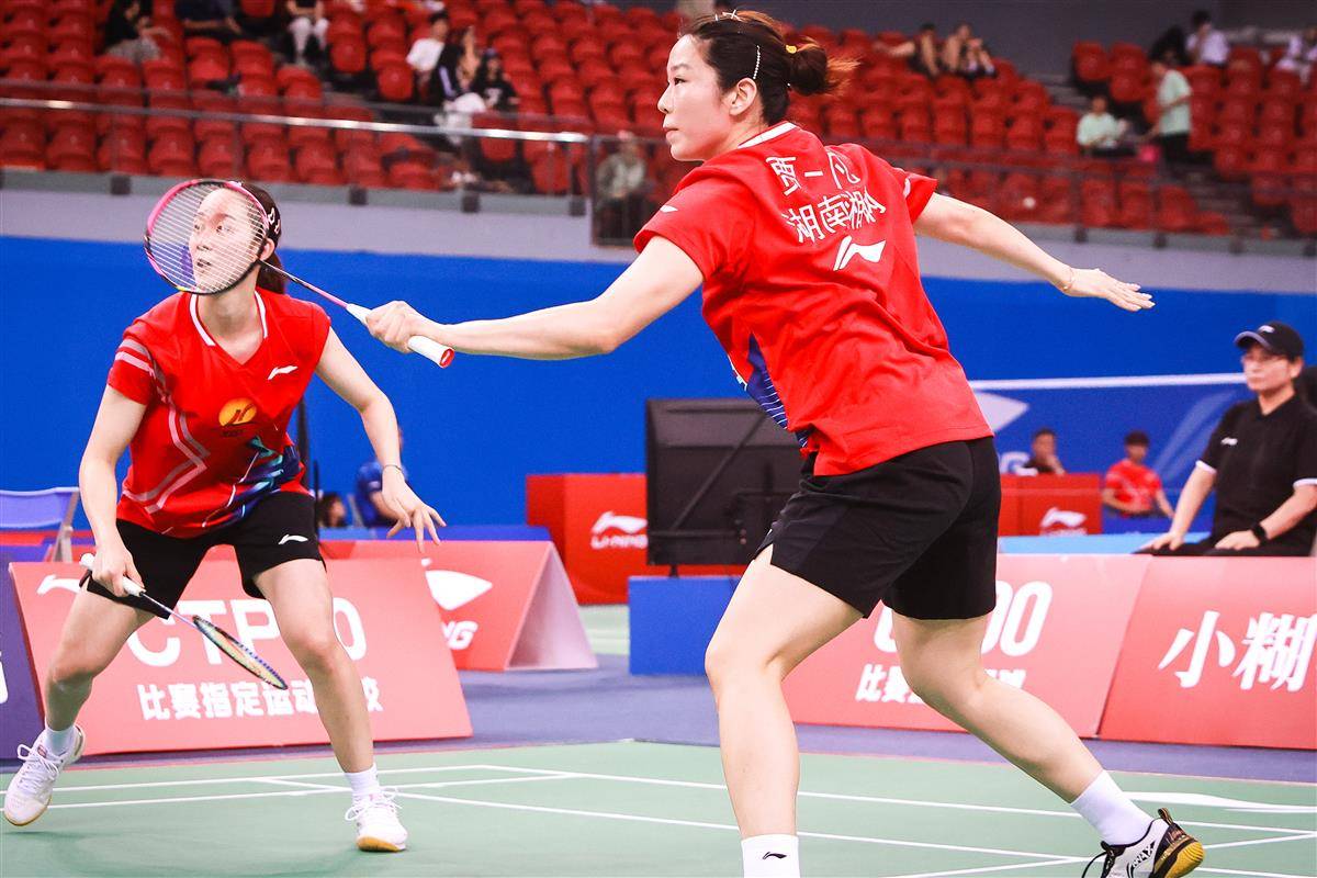 8月14日,十五运羽毛球资格赛在宜昌奥体继续进行,在当晚一场成年组女团焦点比赛中,代表湖南出战的奥运冠军贾一凡携手小将张驰,以2比1(16-21、21-12、26-24)逆转国家队队友、四川组合郑雨/张殊贤。中国羽毛球协会主席张军、奥运冠军谌龙等众多羽毛球名宿现场观赛。(湖北日报全媒记者时龚摄)