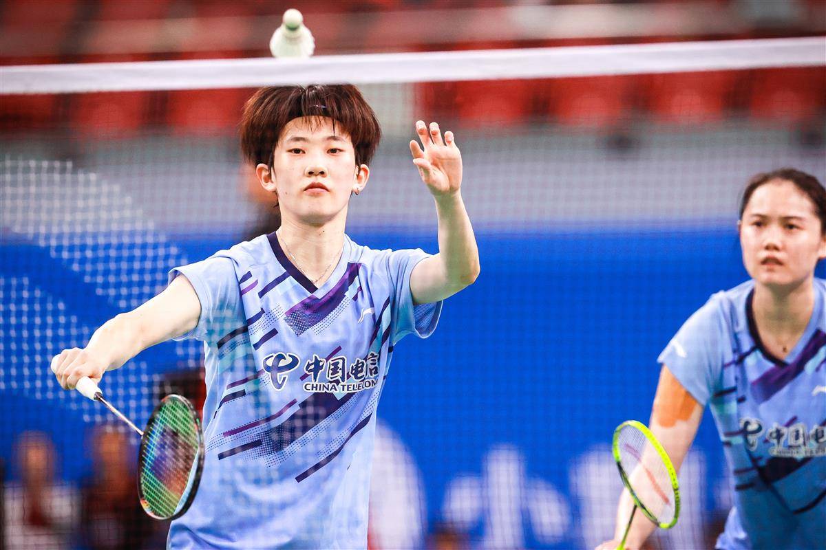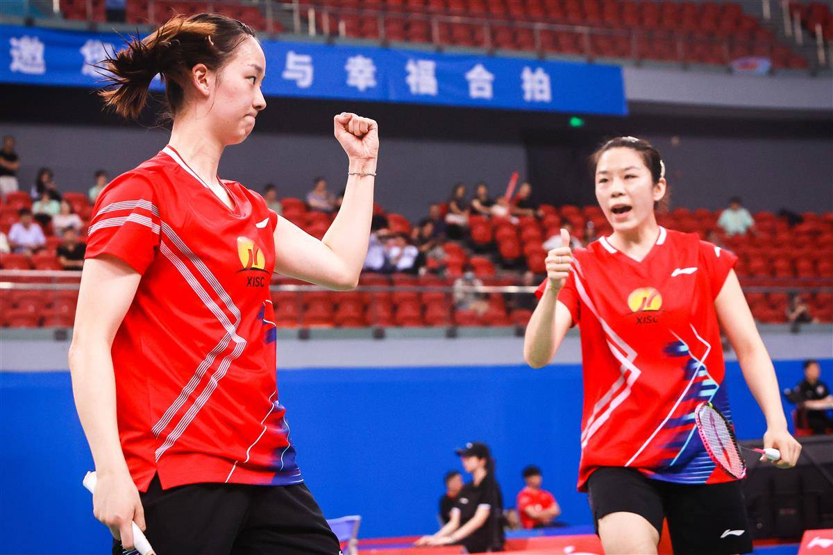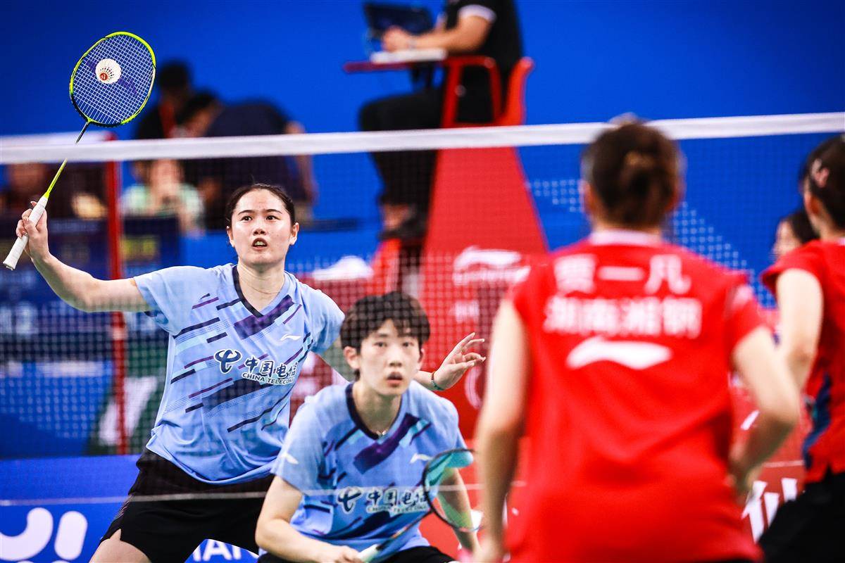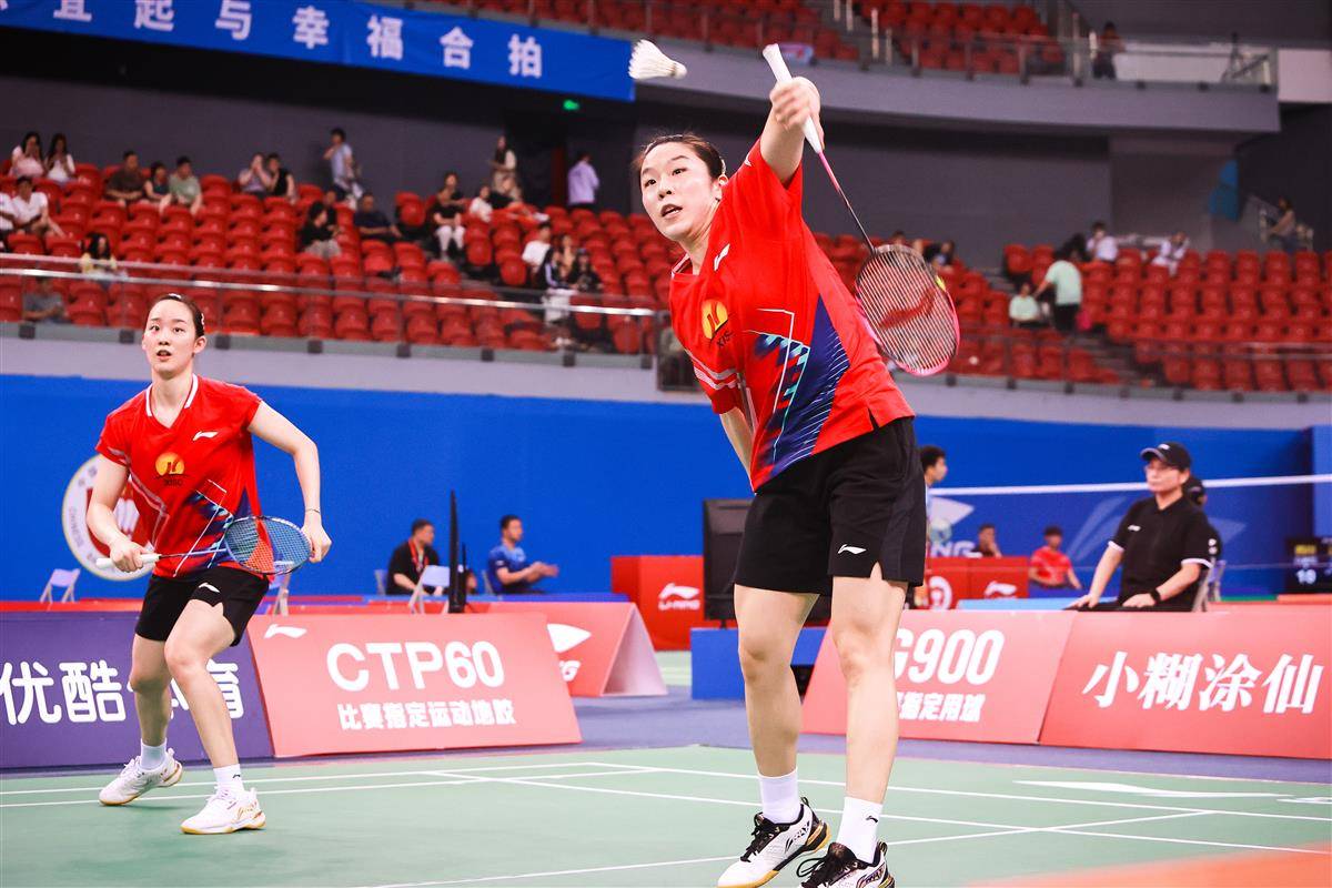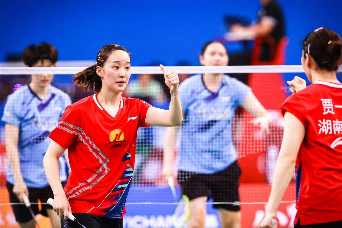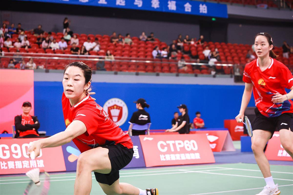 8月14日,十五运羽毛球资格赛在宜昌奥体继续进行,在当晚一场成年组女团焦点比赛中,代表湖南出战的奥运冠军贾一凡携手小将张驰,以2比1(16-21、21-12、26-24)逆转国家队队友、四川组合郑雨/张殊贤。中国羽毛球协会主席张军、奥运冠军谌龙等众多羽毛球名宿现场观赛。(湖北日报全媒记者时龚摄)