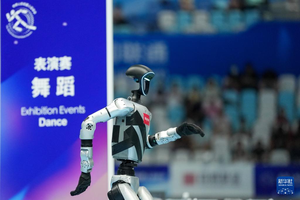 8月15日,来自常州海毅欧智能科技有限公司队的人形机器人在舞蹈表演赛中。新华社记者 鞠焕宗 摄