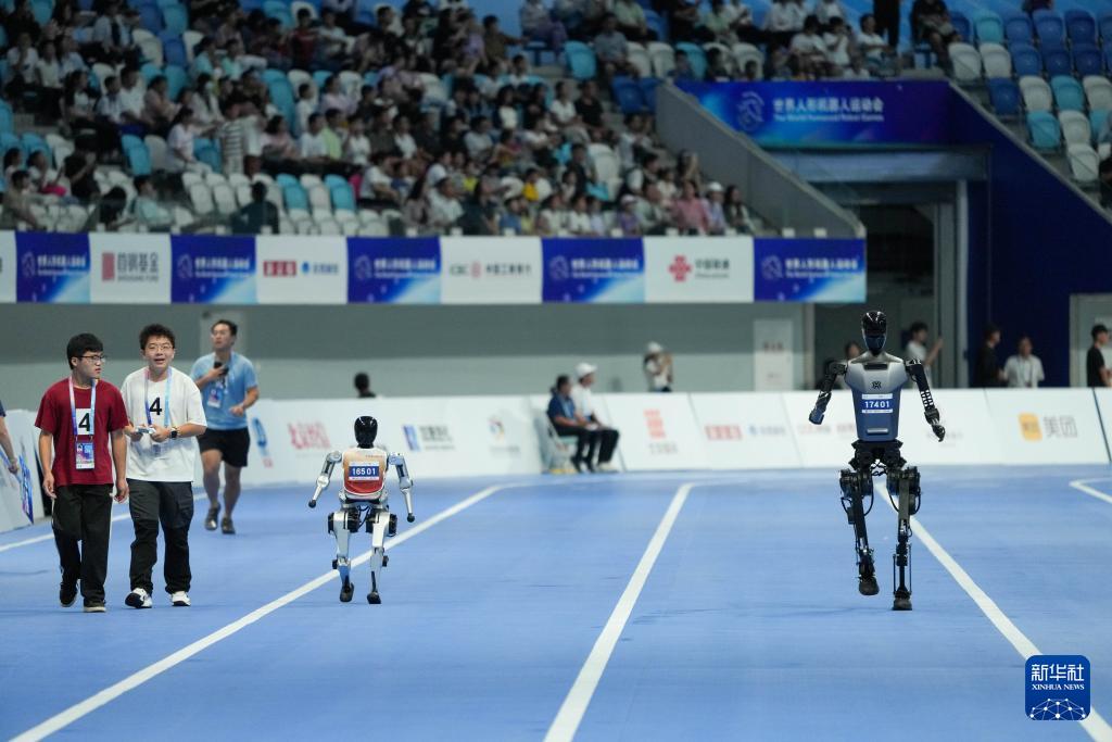 8月15日,来自行者队的人形机器人在1500米比赛中。新华社记者 鞠焕宗 摄