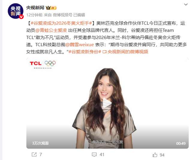 据央视新闻消息,奥林匹克全球合作伙伴TCL今日正式宣布,运动员谷爱凌出任其全球品牌代言人。同时,谷爱凌还将担任Team TCL“敢为不凡”运动员,并受邀参与2026年米兰-科尔蒂纳丹佩佐冬奥会火炬传递。