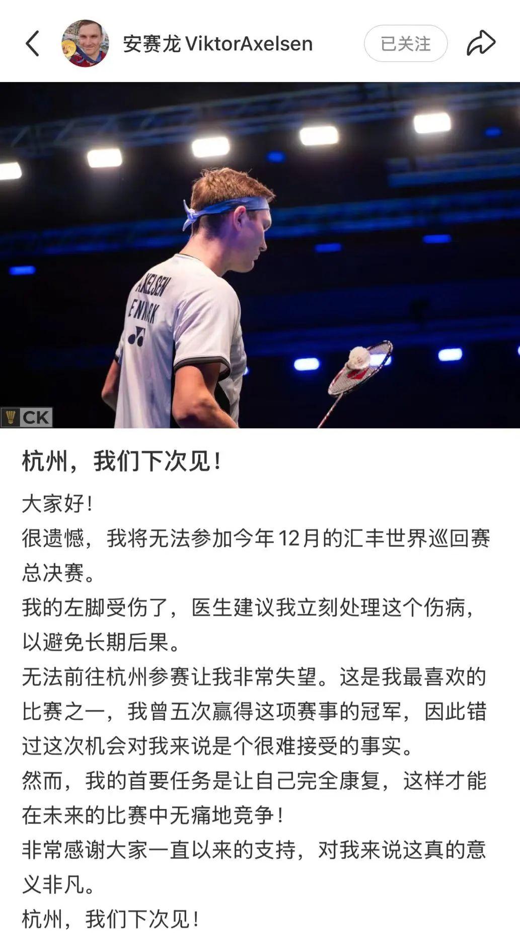 8月19日晚,丹麦羽毛球运动员安赛龙在社交媒体上发文称: