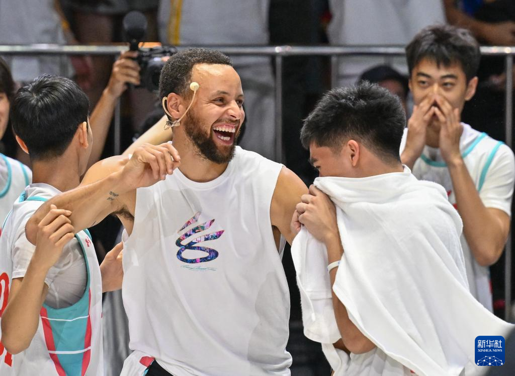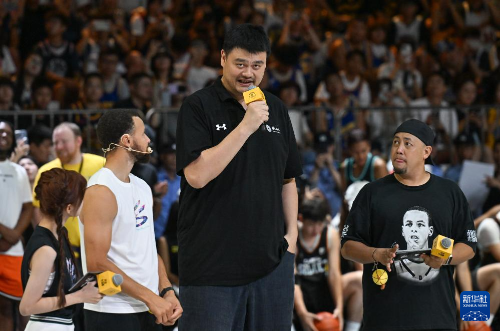 8月20日,姚明(右上)、库里与来自四川的乡村女子篮球队队员互动。