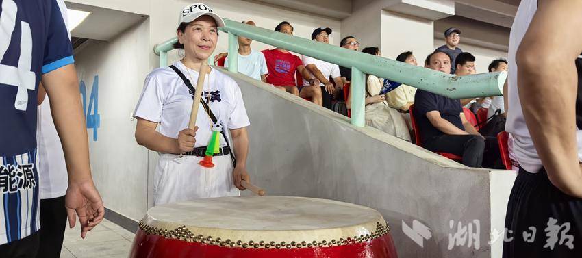 看台上,蔡甸球迷扛出8面旗帜,并击鼓壮威,还有装扮成哪吒模样的女球迷,站在最高处,高喊“蔡甸,进一球!”气氛热烈。