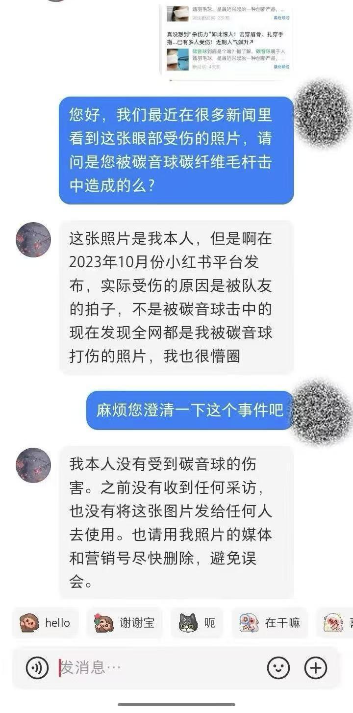 当事人在接受电话采访时表示:“两年多前(的事)了,那个时候大家都是新手,在双打的过程中跟队友一起去接这个球,队友不小心用拍子拍到了我的眉骨上。当时血流如注,到医院缝了六针。”让当事人也感到震惊的是,最近网上突然全是自己两年前受伤的照片,并且关键词是和自己受伤全无关系的碳音球,她也感觉很困惑。目前,因为报道内容不实,“新碳音击穿眉骨”相关报道已删除。