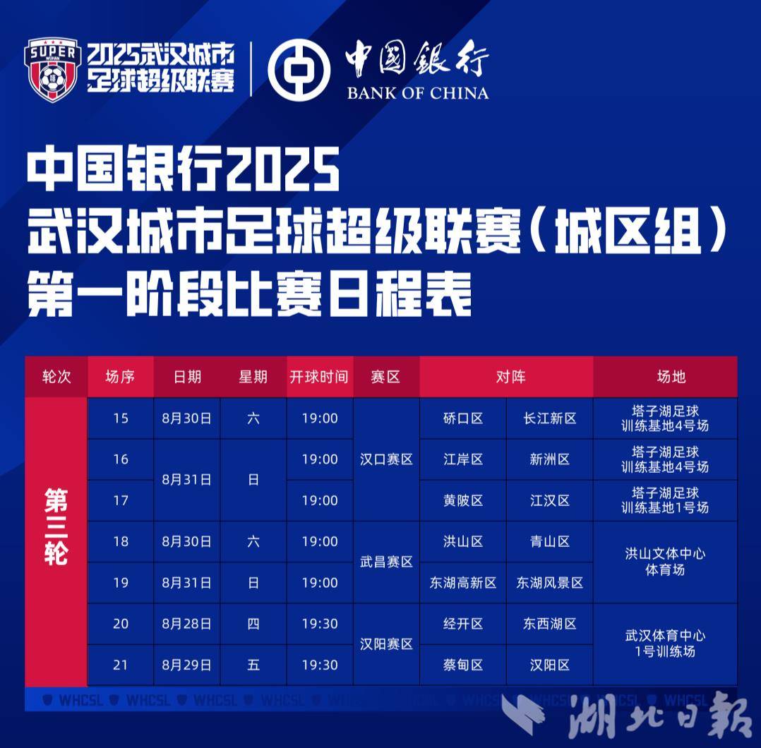 湖北日报讯(记者汪洋)根据最新公布的汉超(城区组)第一阶段赛程,本周将进行第三轮共7场比赛,具体为:
