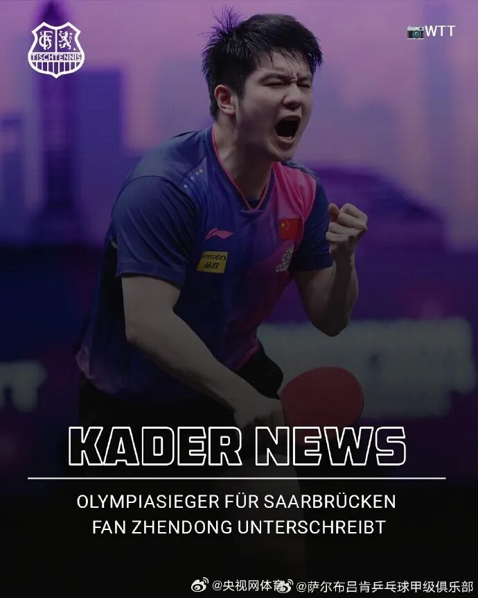 2025年6月1日,据央视网体育消息,德甲联赛萨尔布吕肯乒乓球甲级俱乐部宣布,奥运冠军樊振东加盟。在俱乐部官方声明中,樊振东表示:我真的很期待在萨尔布吕肯和德甲的新挑战,体验新的环境——并与球队一起赢得更多的胜利。官宣声明发布后,与樊振东成为俱乐部队友的莫雷加德也表态称,能和樊振东成为队友很荣幸。