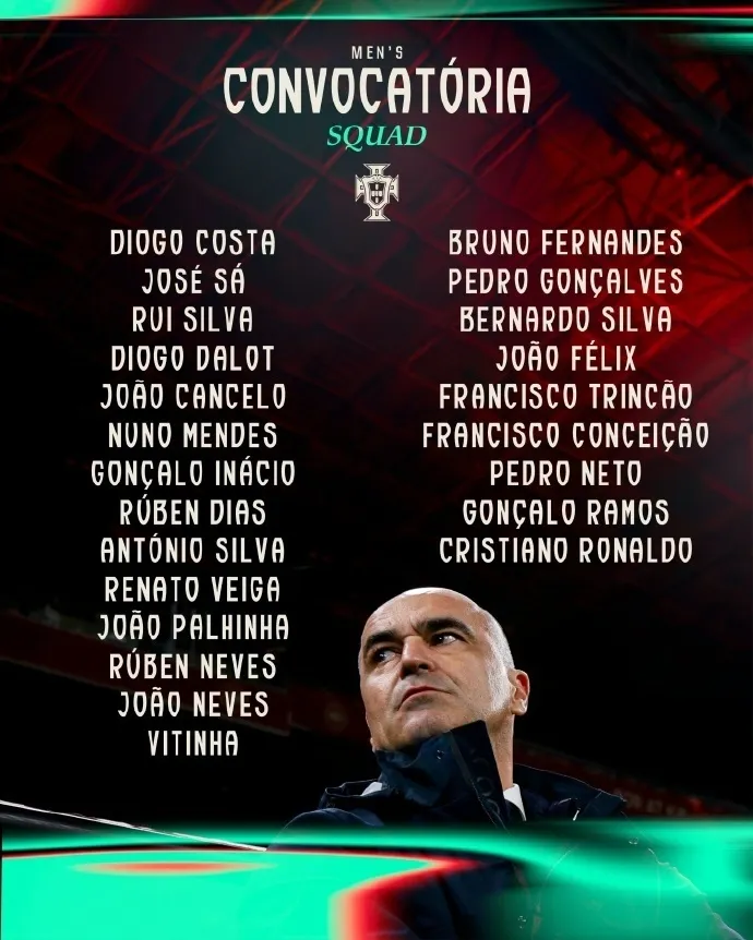 中场:帕利尼亚(热刺)、鲁本-内维斯(利雅得新月)、若昂-内维斯(巴黎)、维蒂尼亚(巴黎)、B费(曼联)、贡萨尔维斯(葡萄牙体育)、B席(曼城)