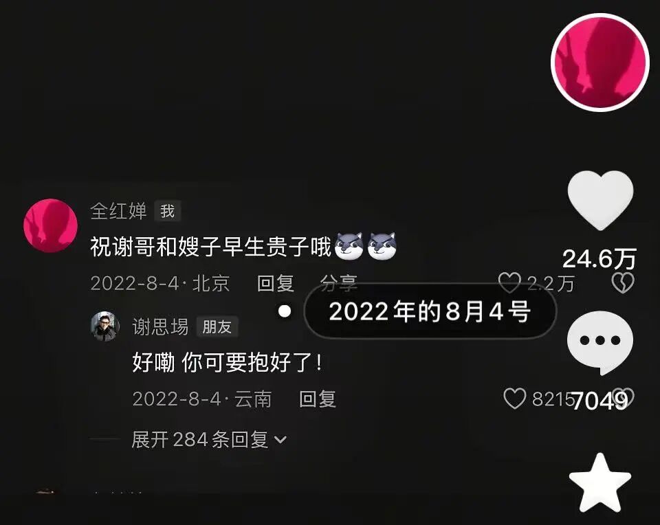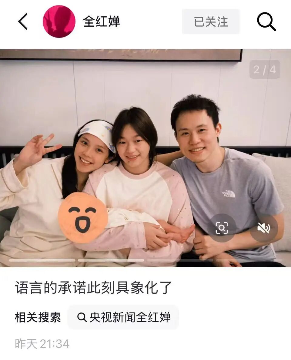 8月30日,全红婵社媒分享与谢思埸一家三口合影,并表示,语言的承诺此刻具象化了。并晒出三年前评论截图:全红婵祝谢哥和嫂子早生贵子,谢思埸回复:“好嘞 你可要抱好了”。