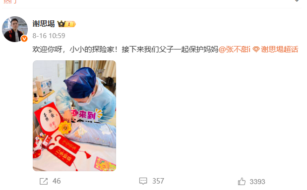 8月16日,跳水运动员谢思埸 发文官宣生子:“欢迎你呀,小小的探险家!接下来我们父子一起保护妈妈。”