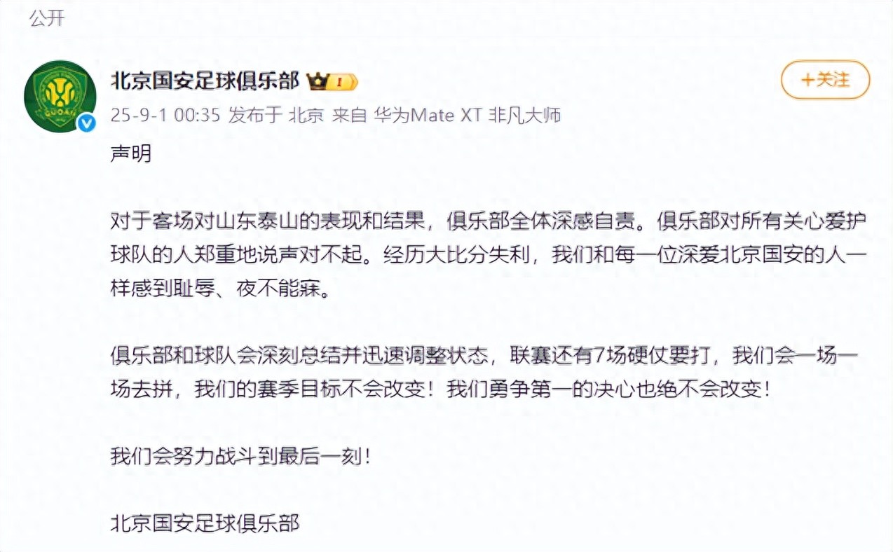 9月1日凌晨,北京国安足球俱乐部发布声明,详情如下: