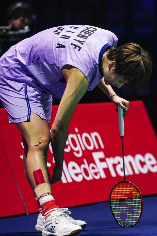 8月31日,陈雨菲在女单决赛中检查脚部伤势。新华社记者 彭子洋 摄
