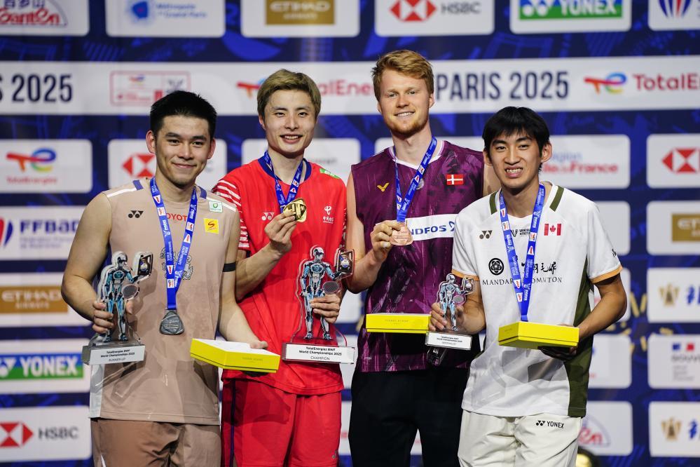 8月31日,冠军中国选手石宇奇(左二)、亚军泰国选手昆拉武特(左一)和季军丹麦选手安东森(右二)、加拿大选手赖浩俊在2025年世界羽毛球锦标赛男单颁奖仪式上。新华社记者 彭子洋 摄