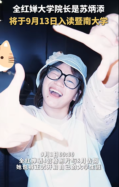 9月13日,奥运冠军全红婵将正式成为暨南大学运动训练专业的一名新生,这位18岁的“三金王”即将在这所211高校开启她的人生新篇章。