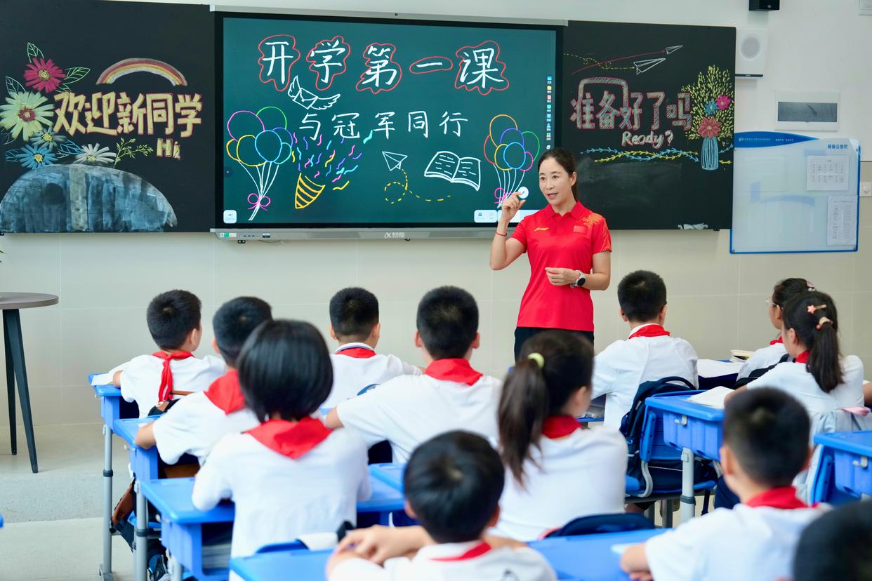 当天上午,合肥市五十中学天鹅湖教育集团天鹅湖校区(奥体分部)举办“承冠军志 燃体育情 赴青春约”开学典礼,王丽萍受聘担任该教育集团体育校长。在七年级一班的教室里,王丽萍与同学们亲切交流,分享了她对体育精神的理解——体育锻炼的意义不仅在于强健体魄,更在于磨炼意志。