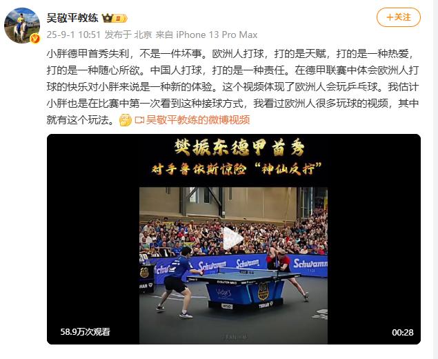 小胖德甲首秀失利,不是一件坏事。欧洲人打球,打的是天赋,打的是一种热爱,打的是一种随心所欲。中国人打球,打的是一种责任。在德甲联赛中体会欧洲人打球的快乐对小胖来说是一种新的体验。这个视频体现了欧洲人会玩乒乓球。我估计小胖也是在比赛中第一次看到这种接球方式,我看过欧洲人很多玩球的视频,其中就有这个玩法。