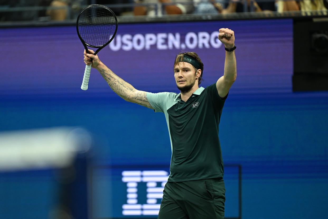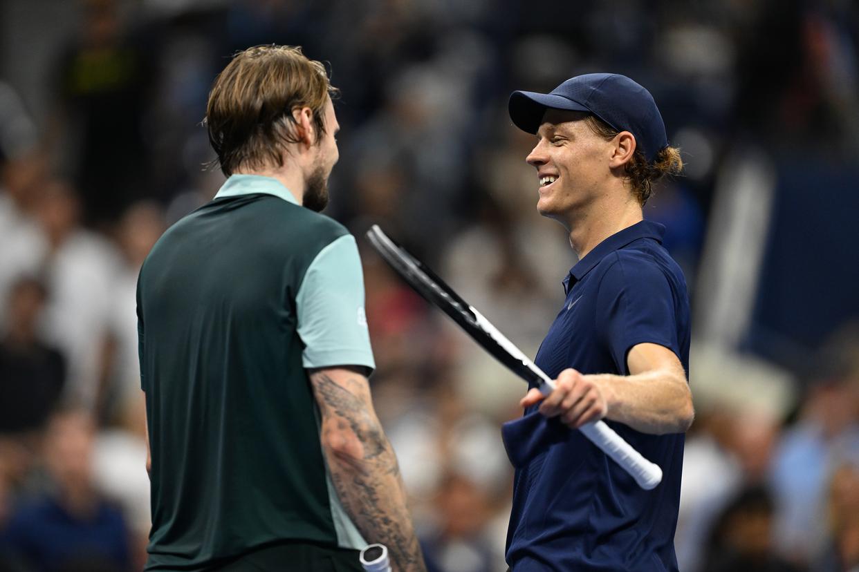 9月1日,辛纳(右)和布勃利克在比赛后致意。新华社记者 李睿 摄